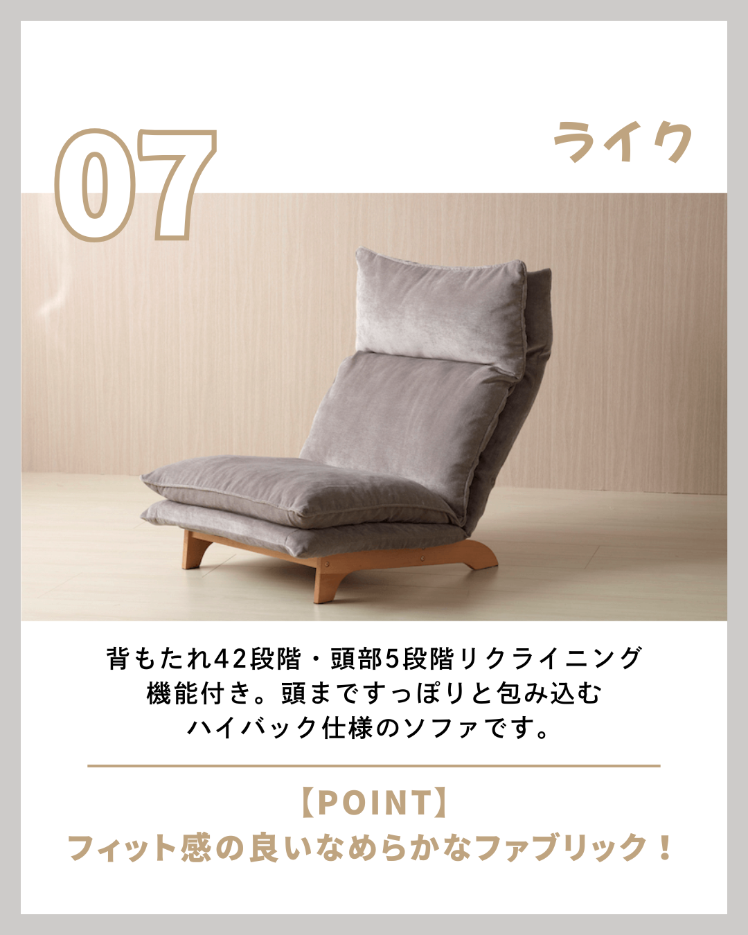 | POINT フィット感を重視してコーデュロイ調のなめらかな生地をセレクト。一般的なリクライニング式フロアチェアは背面を一度床面まで倒してフラットにした状態からでないと角度調節ができませんが、ライクはフラットにする必要がないのでスペースを選ばず角度調節が可能です。 |