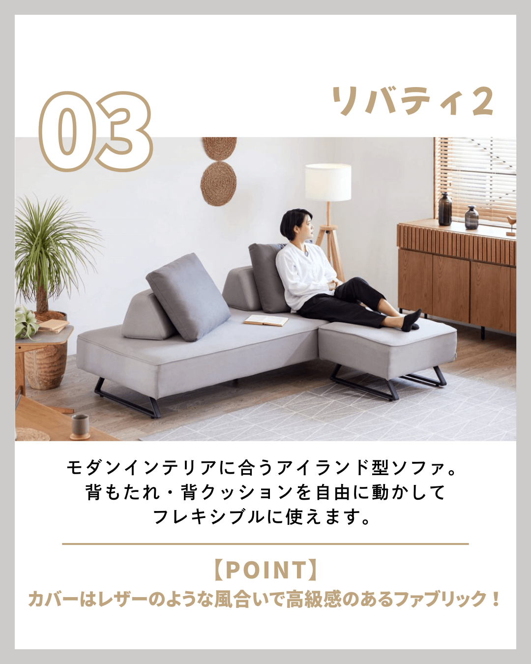 モダンインテリアに合うアイランド型ソファ。背もたれ・背クッションを自由に動かしてフレキシブルに使えます。