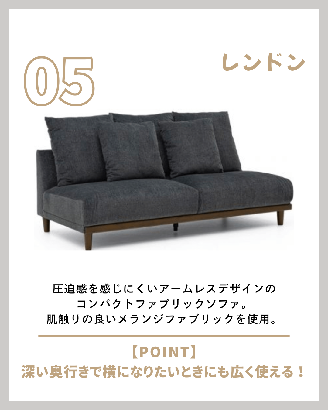 圧迫感を感じにくいアームレスデザインのコンパクトファブリックソファ。肌触りの良いメランジファブリックを使用しています。