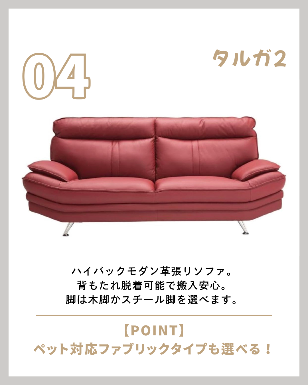 ハイバックモダン革張りソファ。背もたれ脱着可能で搬入安心。脚は木脚かスチール脚を選べます。